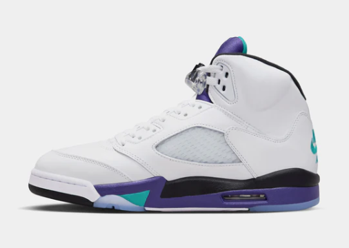 The AJ5 debuted in 1990, with the 'Grape' colorway breaking away from traditional Jordan colors by combining smooth white leather with Grape Ice and New Emerald accents. Originally nodding to North Carolina's budding NBA team, it quickly became a cultural icon in '90s pop culture. Known for its bold stance, bump-out collar, and jagged midsole, this version features a streamlined collar and slightly slanted toe shape, while Nike Air branding reappears on the heel. With translucent netting, outsoles, and clear lace locks, this edition delivers an icy finish, complemented by special packaging that echoes the era's hoops nostalgia.